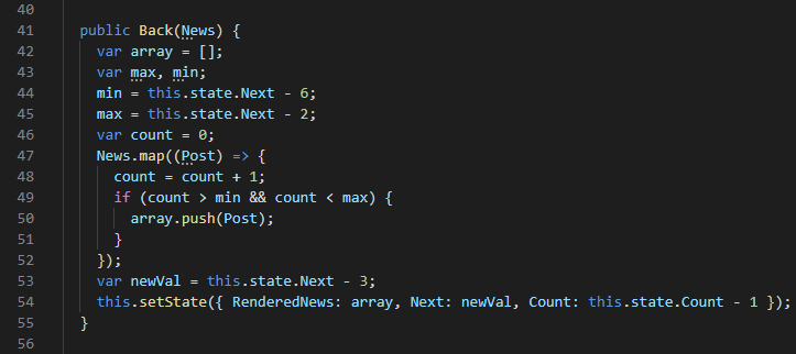 When the user clicks on the Next button we define the same variables as in the ComponentDidMount method. In this method we want to set the min variable to the current news post number so it will work dynamically.