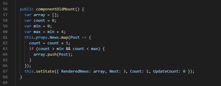 Check out the componentDidMount for either of the styles ( they’re both the same ) and look at what we do. We first set array, count, min, and max variables. What the min and max are for is to locate the first news posts that we want to render. These will be the first 3 news posts so we set the max to be equal to the minimum + 4. When we check to make sure we’re getting the right posts, we have to have less than 4 posts- 3 posts.