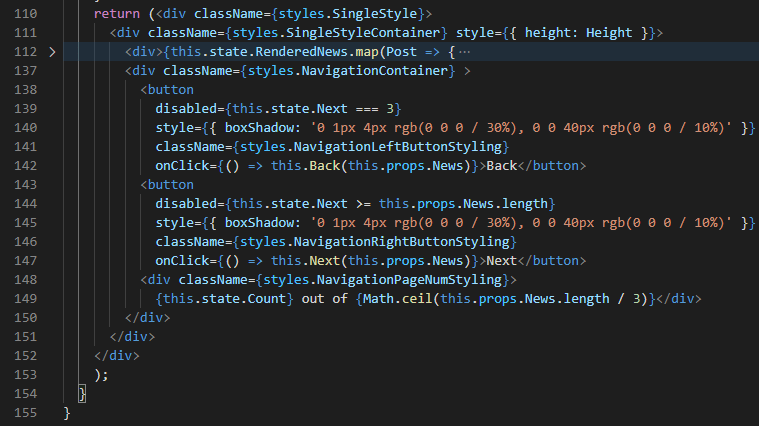 Just by a quick glance at these buttons you can see that both of them have a disabled ternary. Obviously you shouldn’t be able to go back if you’re on the first page, there is nothing to go back to, so the back button is disabled when the Next State Property is 3. The next button is disabled when you’ve reached the last page. If the current state of Next ( say 9 because we increment by 3 ) is greater than or equal to how many news posts we have ( 8 ), then disable the next button.