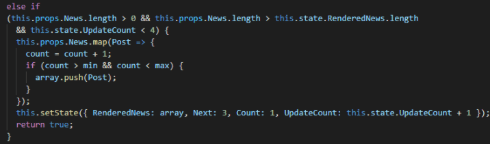 We create some variables: array, count, min, and max. These are used for getting the right news posts. You can check out this in another one of my blogs, React-News-Pagination.