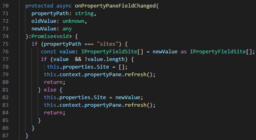In this method we have a check to see if the updated property was adding or deselecting a site. If you did update the selected sites, and the propertyPath is “sites”, then go ahead and create a constant called value casted to the IPropertyFieldSite array.