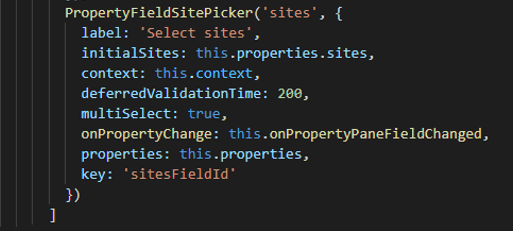 In the React News Web part typescript file in the getPropertyPaneConfiguration method, we have a property field site picker control. When the property value changes (onPropertyChange) it calls the on property pane field changed method.