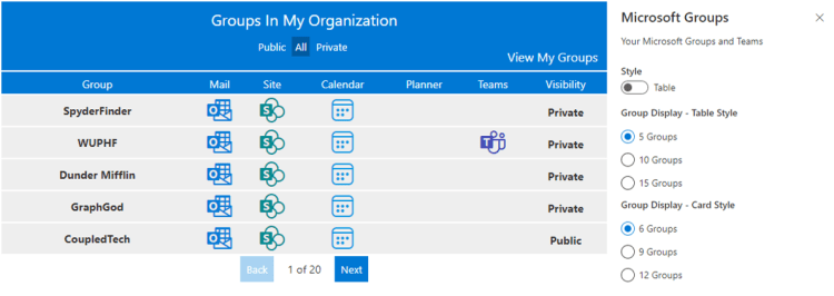 There is now a Style toggle in the web part property pane that you can choose either the original table or the new card list. The card list makes use of the DocumentCard from the Fluent UI React Controls! You can choose if you want 6, 9, or 12 groups displayed at one time.