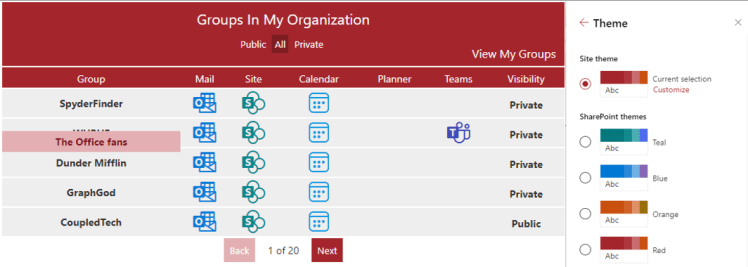 The React Groups and Teams web part may have some new changes rolling out soon! While it keeps the original features and tools it includes some new ones like pagination, a style toggle, and group display filters. Look out for updates!